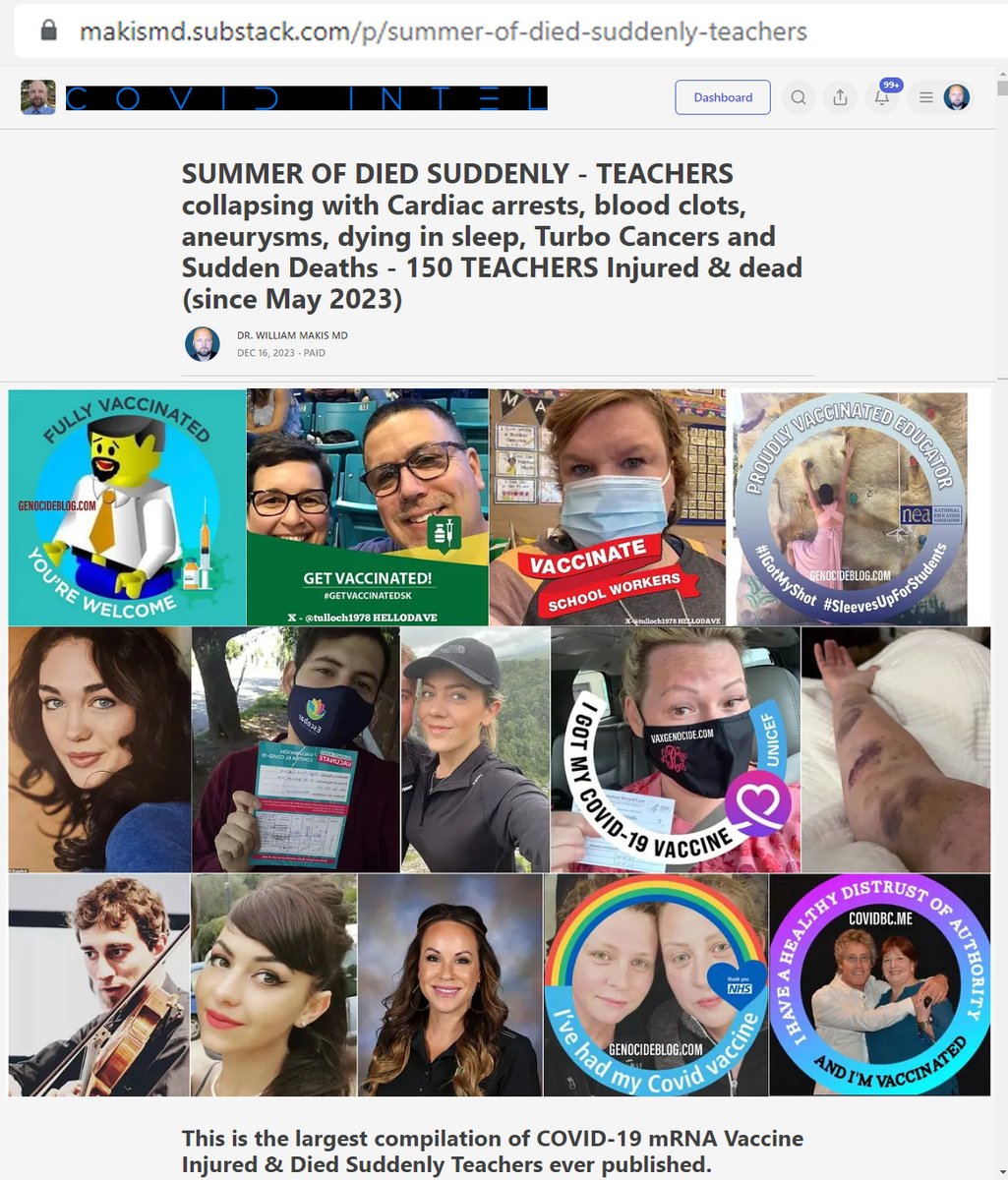 NEW ARTICLE: TEACHERS collapsing with Cardiac arrests, blood clots, aneurysms, dying in sleep, Turbo Cancers & Sudden Deaths - 150 TEACHERS Injured & dead (since May 2023)