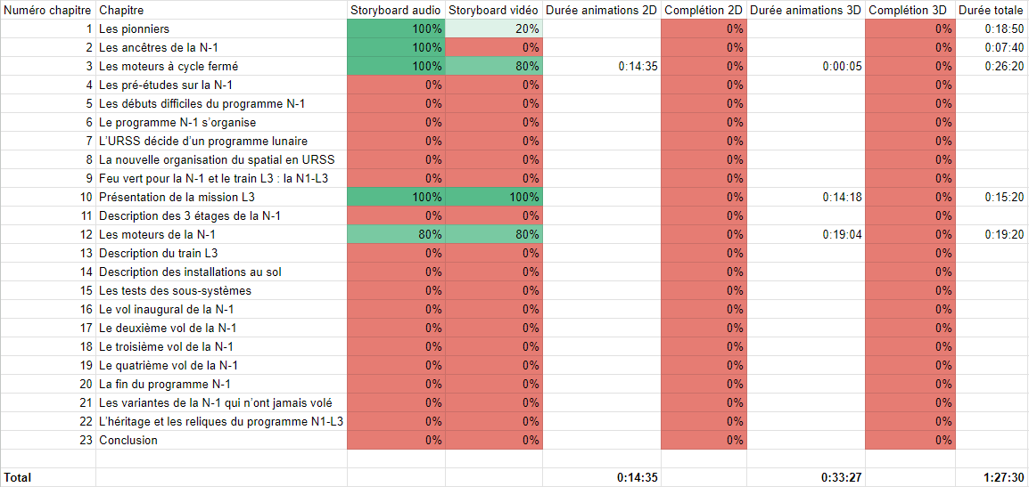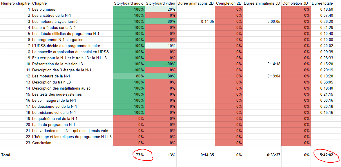 24/01/2024: le storyboard audio est terminé à 77%, mais ça représente déjà 5h42 de documentaire.