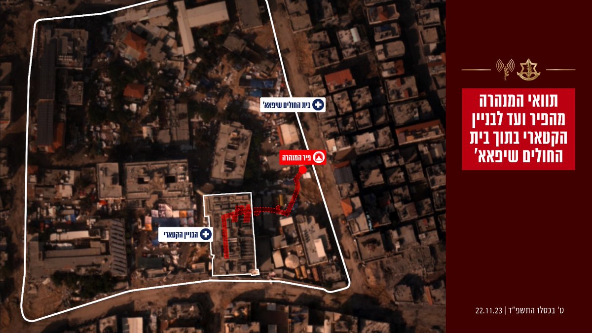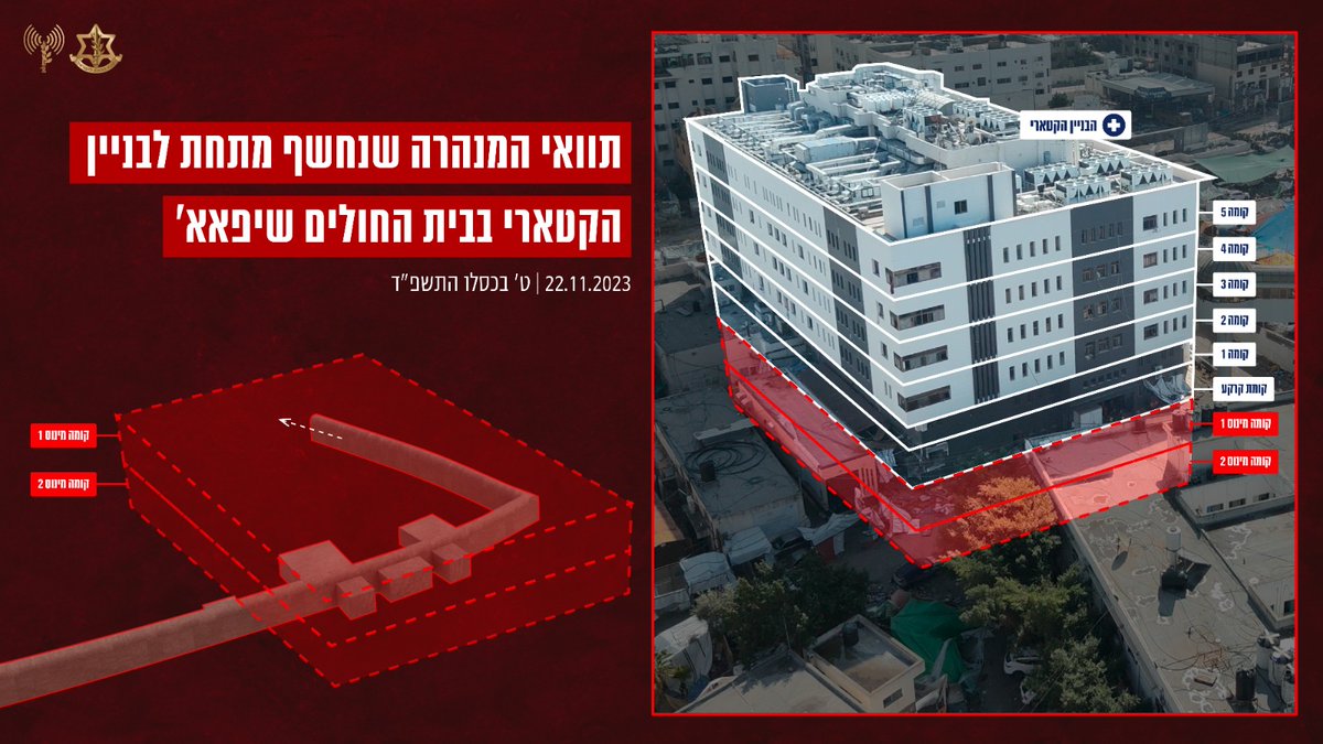 Infographics show the estimated route of the tunnel, under the so-called Qatari building at Shifa.