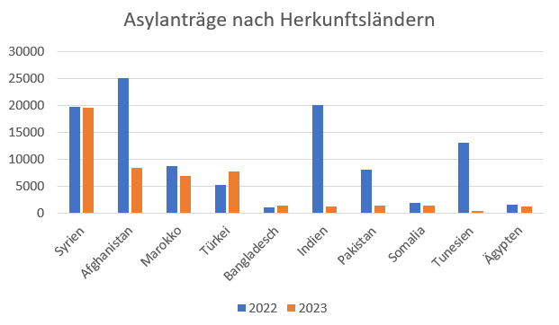 Bei Herkunftsländern sieht man: Im Vergleich zu 2022 gleich viele Menschen aus Syrien, Marokko und Ägypten, Anträge von Afghan:innen gedrittelt (von 25k auf 8k).
