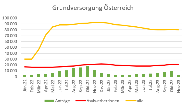 Trotz stark schwankender Anzahl von Asylanträgen (🟢Balken) bleibt Anteil von Asylwerber:innen in Grundversorgung stabil bei ca 20.000 (🔴Linie).