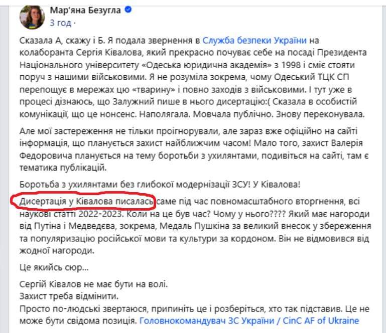 Три з половиною твіти про брехню Безуглої про Залужного. Отже, Залужний не писав дисертацію "у Ківалова". Вона написана в Чернігівській академії пенітенціарної служби. Перелік закладів, де можна захистити дисертацію обмежений. Не завжди можна захиститися там, де писав 1/