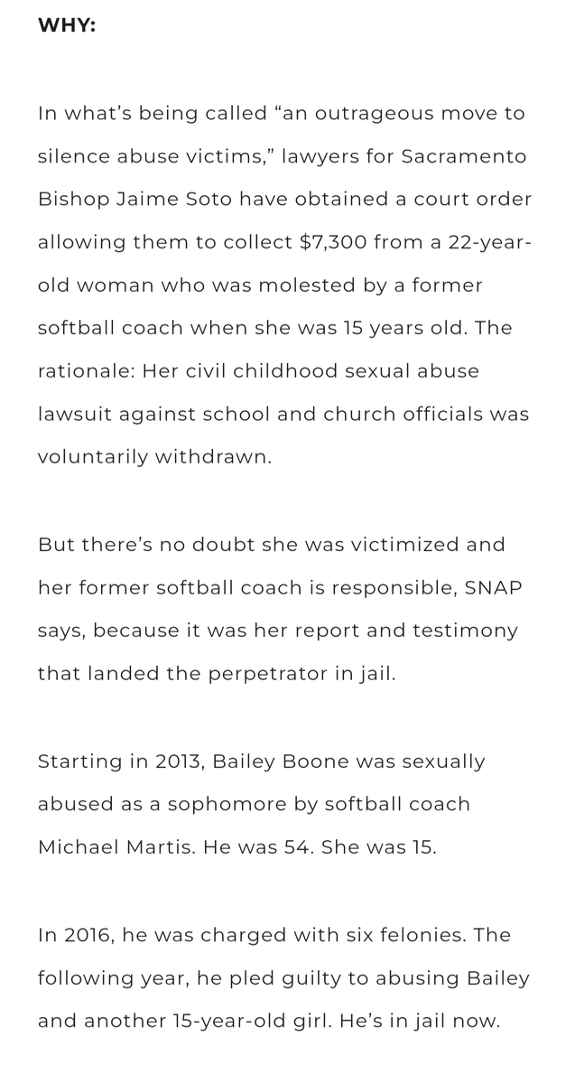 @SNAPNetwork @saccatholic @EricVolz The attorney for the victim, who was, along with another 15 year old girl, groomed & sexually assaulted by her softball coach at a school in @saccatholic before he was convicted, pointed out that the Lathrop strategy was kinda evil, actually