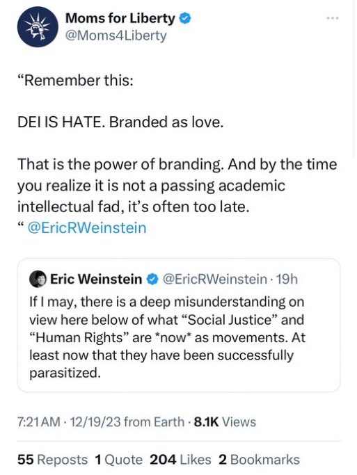 Warning. Moms for Liberty and their talking point guru (James Lindsay) are winding up their next manufactured outrage campaign to manipulate voters. Diversity Equity and Inclusion (DEI) is the new Critical Race Theory (CRT). 1/