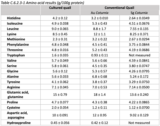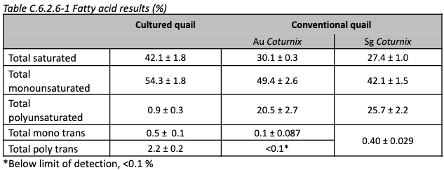 Nutrition: Amino acid and fatty acid results are shown below, compared to conventional quail. No cholesterol values are provided.