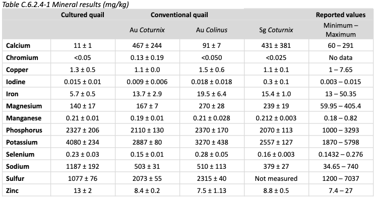 Nutrition: Mineral content is shown below, compared to conventional quail