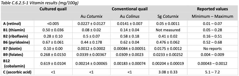 Nutrition: Vitamin content is shown below, compared to conventional quail.