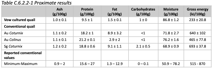 Nutrition: The product's macronutritional profile suggests its water content is higher than conventional quail, its protein content is roughly half, and it contains very little fat
