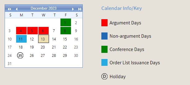 Note: There are no SCOTUS conferences (e.g., when the justices meet privately to weigh which cases to take) scheduled for late December. From the SCOTUS website: 3/