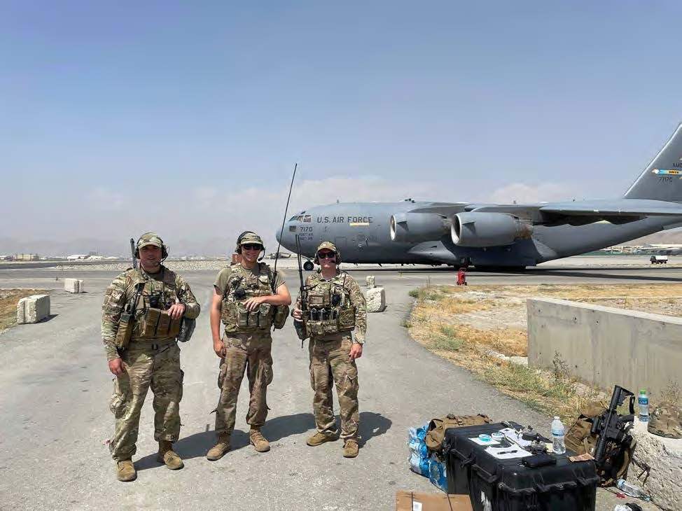 A team of airfield operators, maintainers and air transportation specialists pose with an American flag at Hamid Karzai International Airport during last month's evacuation. (Undated U.S. Air Force photo via 621st Contingency Response Wing)