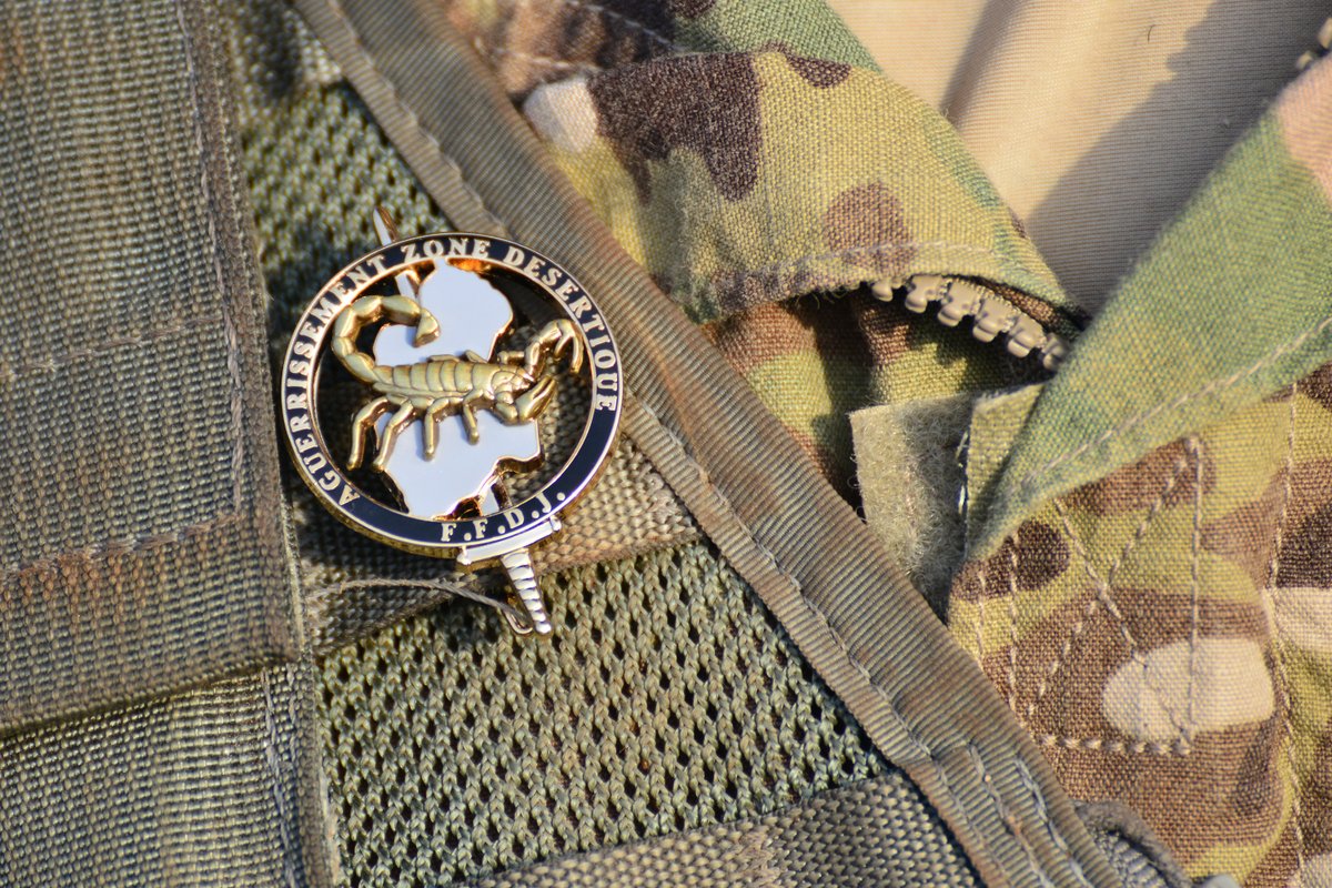 It’s a black and gold pin featuring a scorpion over a silhouette of Djibouti.