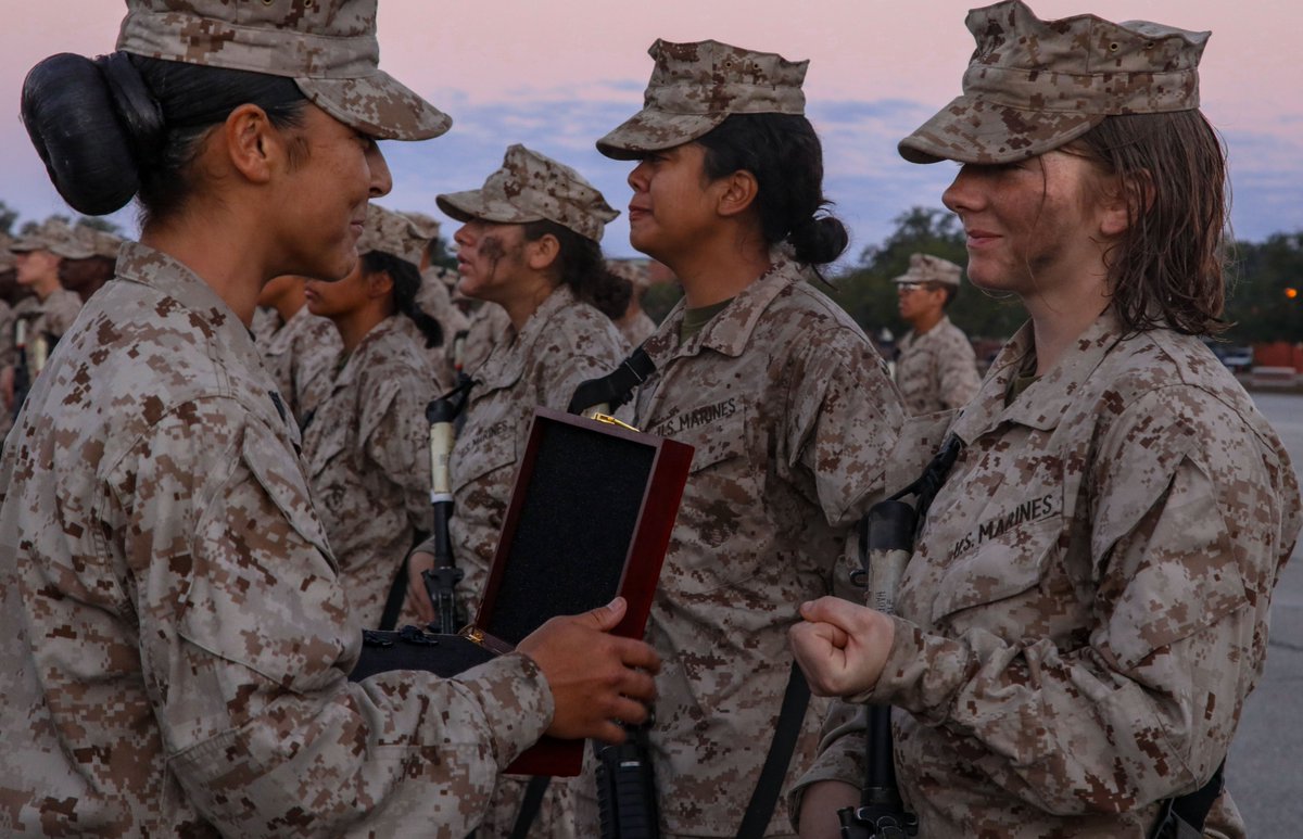 Pfc. Emily Zamudio was in the first platoon of women to complete Marine boot camp in San Diego. She's now the first entry-level female Marine to earn the 0311 MOS at SOI-West on Camp Pendleton, Calif., the service says. (Tessa D. Watts/U.S. Marine Corps) dvidshub.net/news/405503/tr…