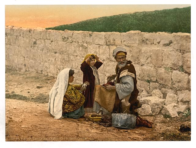 A travelling shoemaker in Jerusalem goes about his daily work. Image