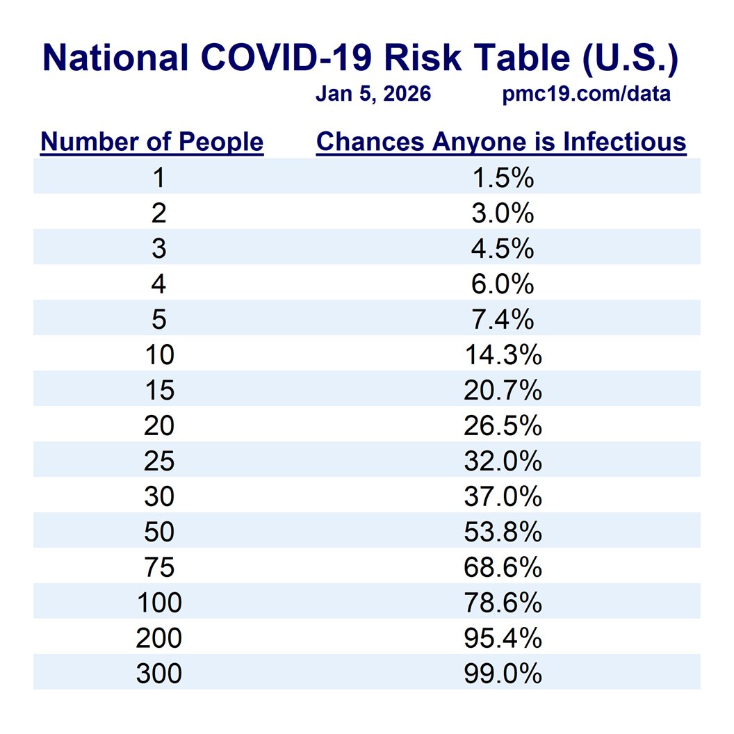Nationally, we are seeing an estimated 892,000 new daily SARS-CoV-2 infections, meaning a 1 in 4 chance of exposure in a room of 15 people. Risk varies considerably by state.