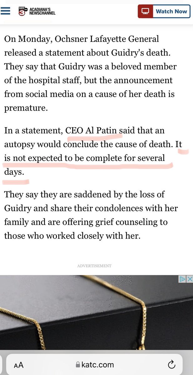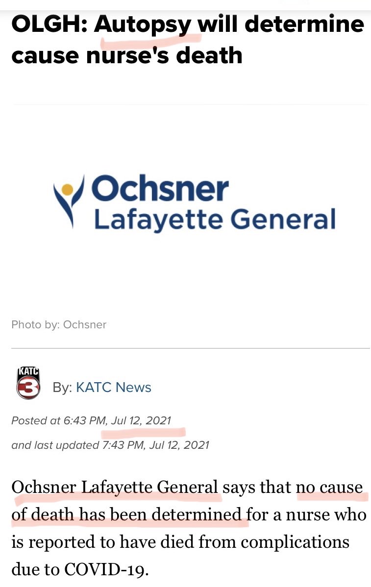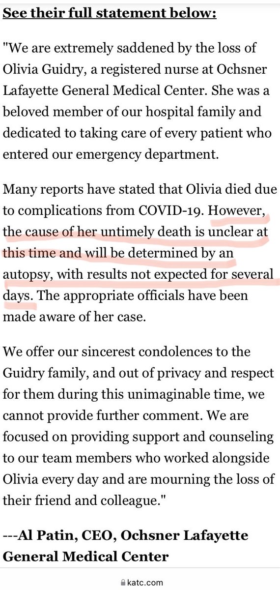 “Ochsner Lafayette General says that no cause of death has been determined for a nurse who is reported to have died from complications due to COVID-19.”