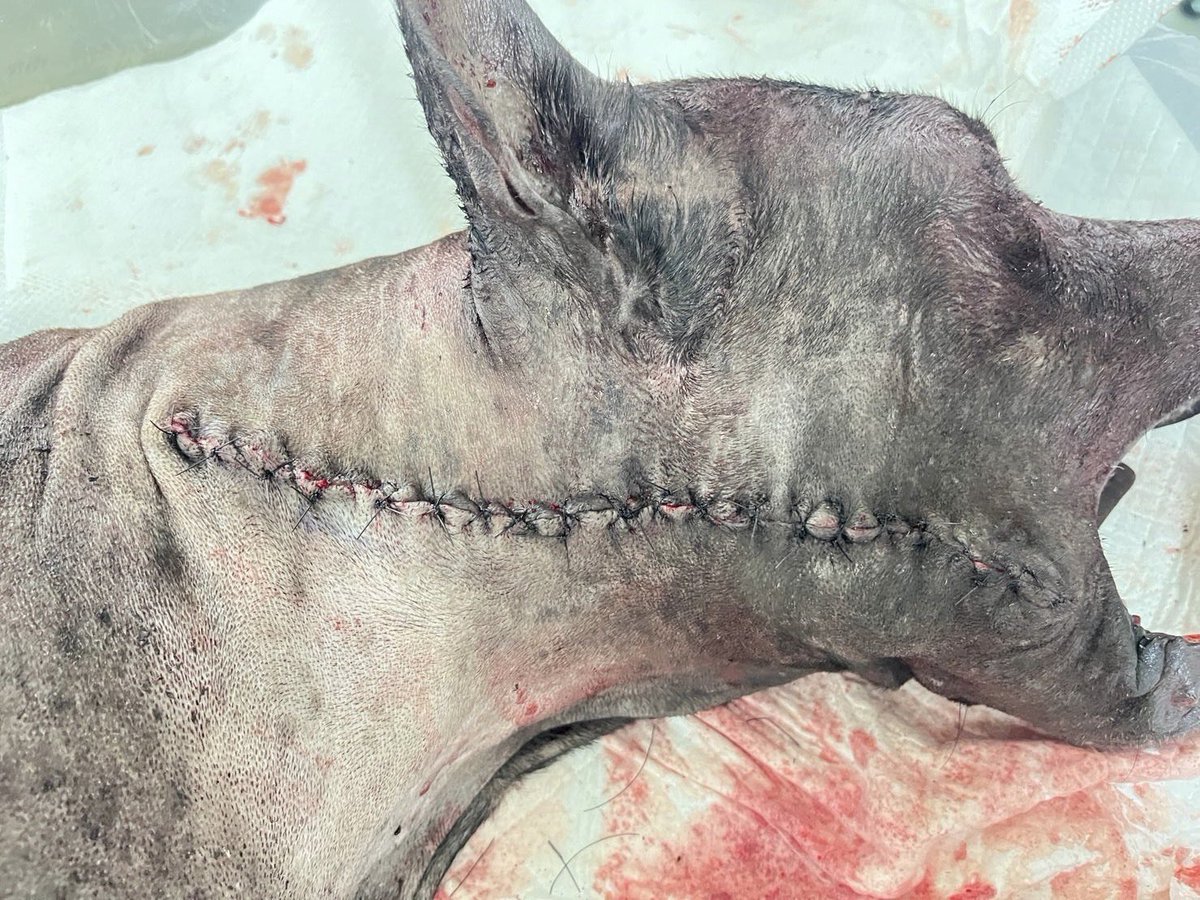 The operation lasted 3 hours and took a huge amount out of Shaq. He was very scared, nervous and in pain despite all the drugs. He made it through the day though and came home this evening. You can see from the scar how much work had to be done (2/5)