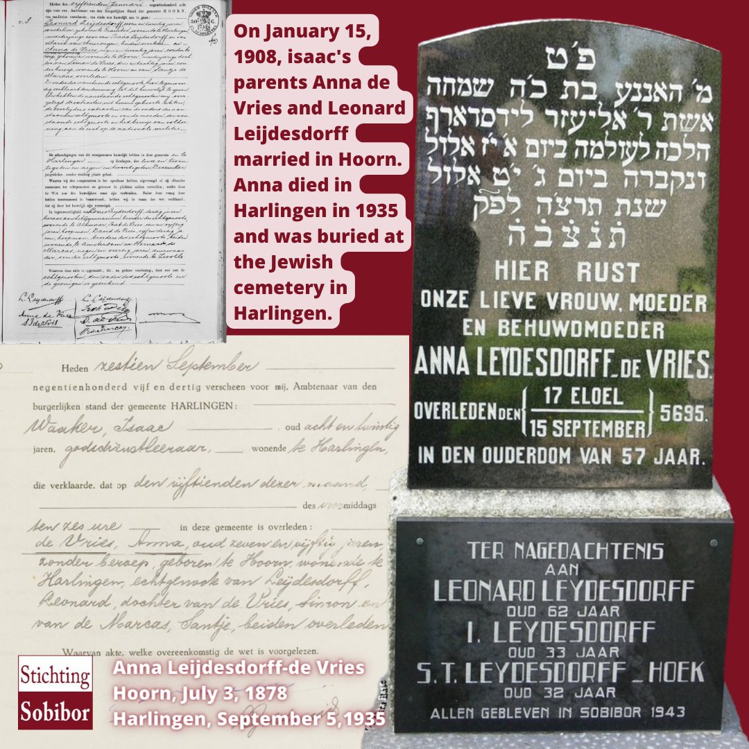 On Jan 15, 1908, a love story began as Isaac's parents, Anna de Vries and Leonard Leijdesdorff, married in Hoorn, where Anna was born. Anna's journey came to a close in 1935 in Harlingen, finding her eternal rest at the Jewish cemetery there. 3/11
