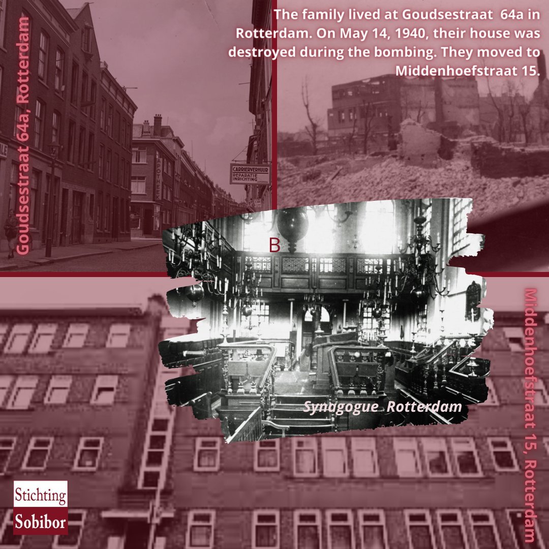 The Huisman family's home at Goudsestraat 64a, Rotterdam, was destroyed by German bombings on May 14, 1940. They then relocated to Middenhoefstraat 15. They are religious and faithfully attend synagogue and at the same time are fully integrated into the Rotterdam. 3/17