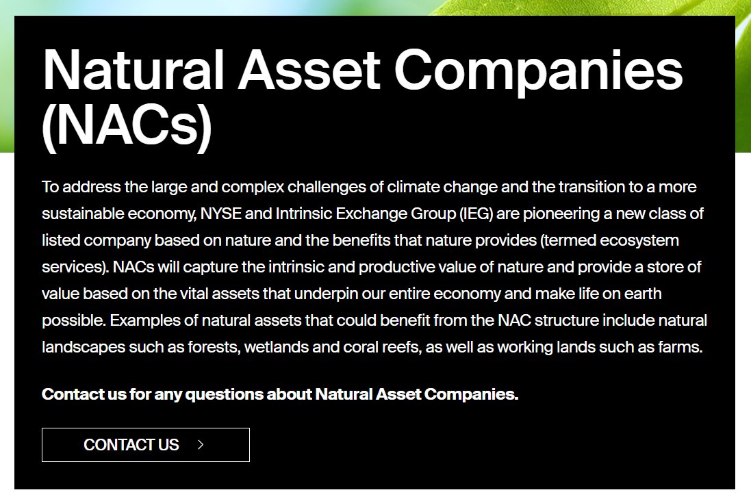 Natural Asset Companies allow for the privatization, commodification, and total control of natural assets, including forests, water, minerals, and so on, and are geared to operationalize their value in new ways, notably "sustainable management," i.e., death cult evil.