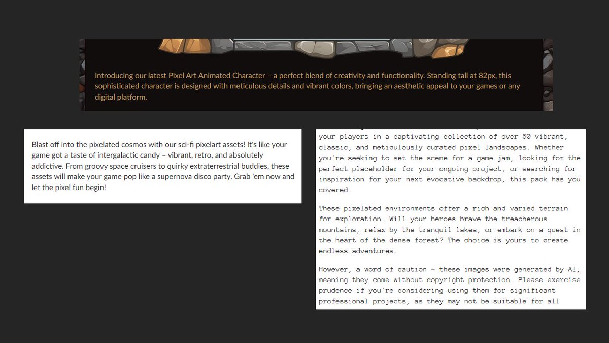 When they'll use AI for generating art they'll also often use AI to generate text. Their descriptions are overly specific and often explain the most basic things (like what 'pixel art' is) or use MANY words where only a few were needed