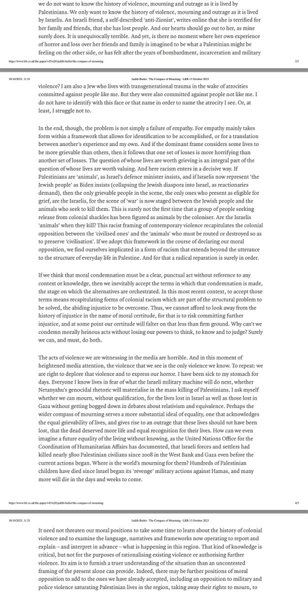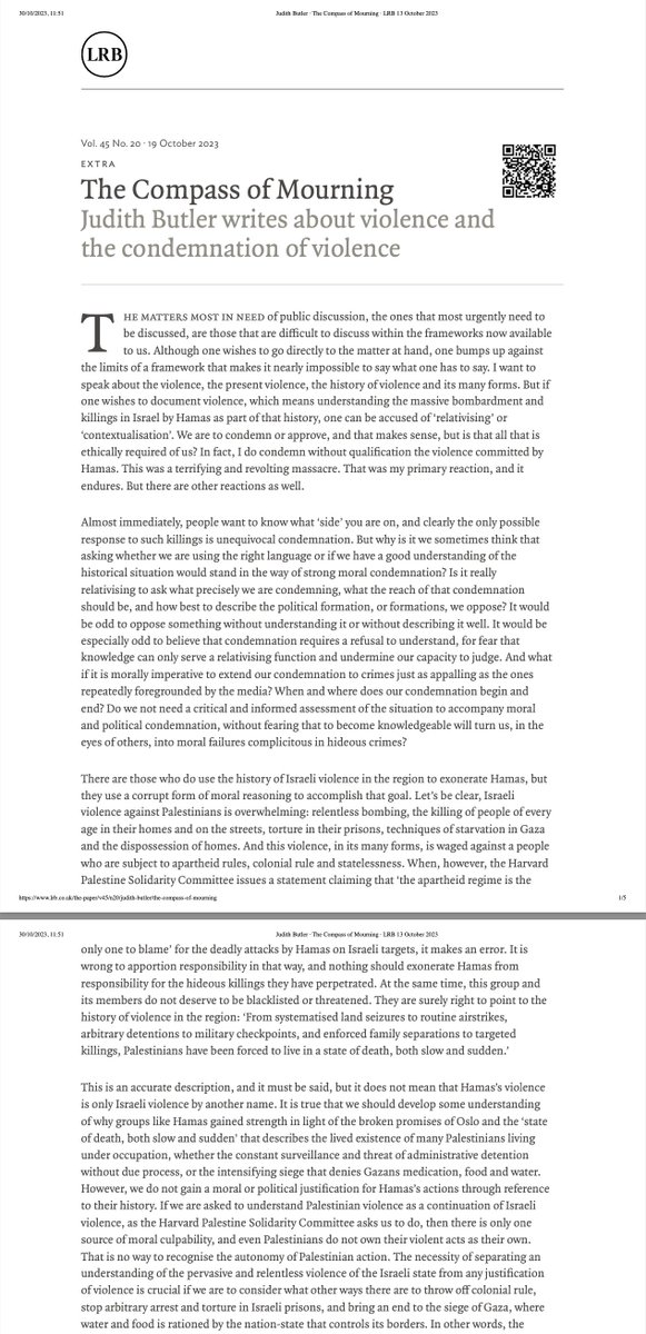 Ist die deutsche Erinnerungskultur Schuld am Simchat-Tora-Massaker? Butler hat die #Hamas vor ca. 15 Jahren als Teil der Linken bezeichnet. Werfen wir einen Blick auf ihre fünfseitige Stellungnahme "The compass of mourning", fünf Tage nach dem unsäglichen Horror in #Israel. 🧵