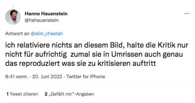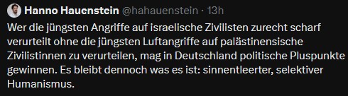 In bekannter Bothsideism-Manier werden Ursache und Wirkung des Krieges absichtlich ausgelassen und die übliche "Gewaltspirale" bemüht, Opfer eines intentionalen Massenmords und zivile Kriegsopfer gleichgesetzt. Applaus erhielt er von üblichen Verdächtigen wie Charlotte Wiedemann.