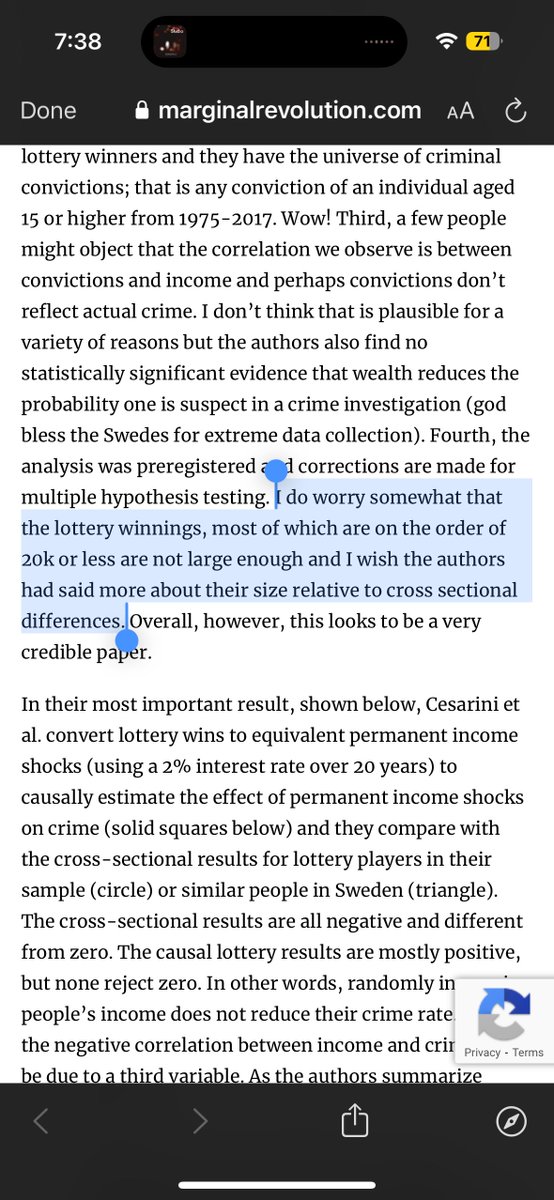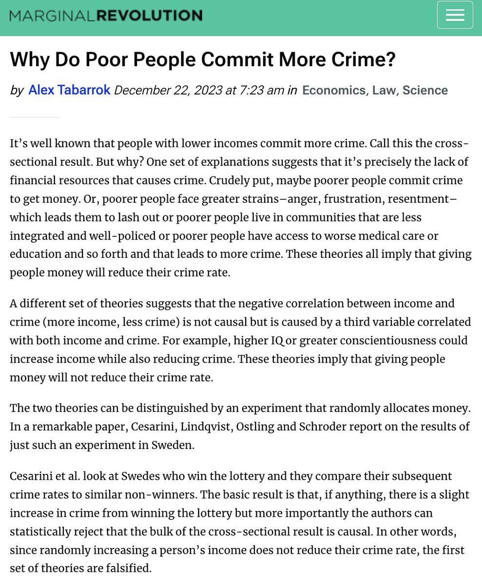This new paper set out to test whether increasing peoples incomes would reduce their crime rate, and found that randomly giving people money did NOT reduce their crime rate.