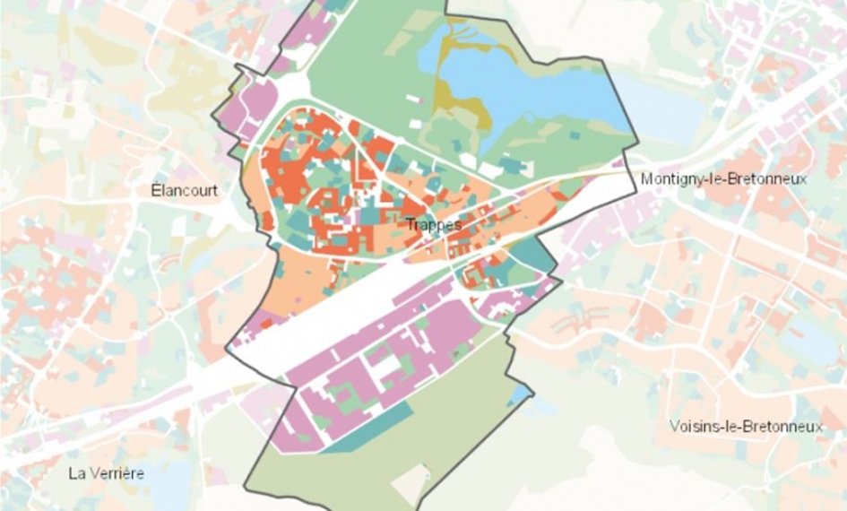 Présentons tout d’abord la typologie du territoire. Trappes est une ville avec un tissu urbain dense (2 481 hab./km2), avec en orange foncé, l’habitat collectif, en clair le pavillonnaire, et entourée de deux zones d’activité de taille moyenne (en violet).