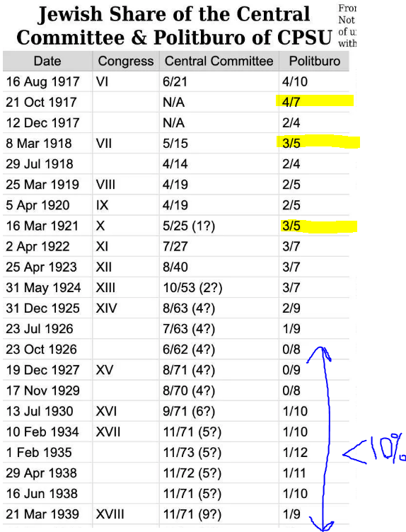 There were moments of rare exception when Jews briefly had a majority in the Politburo - for 3 different years. But keep in mind the Politburo was beholden to the Central Committee. After 1926, Jews never made up more than 10% of its leadership.