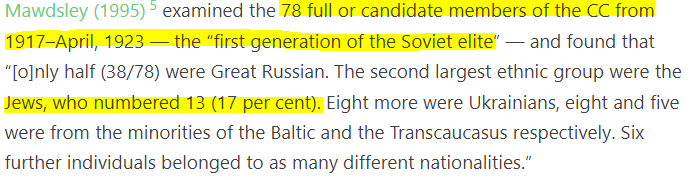 Among full or candidate members of the Central Committee from 1917-1923, the highest power of the Bolshevik party, 17% were Jews. Of the TOTAL ruling elite of the Soviet Union, only 6% were Jews.