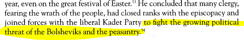 Even the corrupt Orthodox Clergy ran behind the liberal Kadet party, fearing the wrath of the peasant-led Bolsheviks.