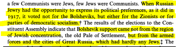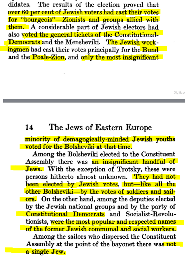 In Russia’s first so-called ‘democratic’ election, over 60% of Jews voted for Zionists, and the rest mainly voted for bundists, Cadets (liberals), Mensheviks and Right-SRs. Keep in mind the Bolsheviks violently disbanded the Constituent Assembly itself - leading to ALL of these parties to either protest or even join the White Armies!