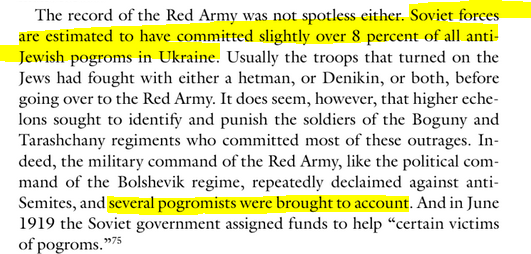 Some pogroms were even conducted by the Red Army soldiers themselves. Though these were not encouraged by the leadership, who retained a principled stance on the matter and opposed all pogroms. But alas, they simply didn’t have control.