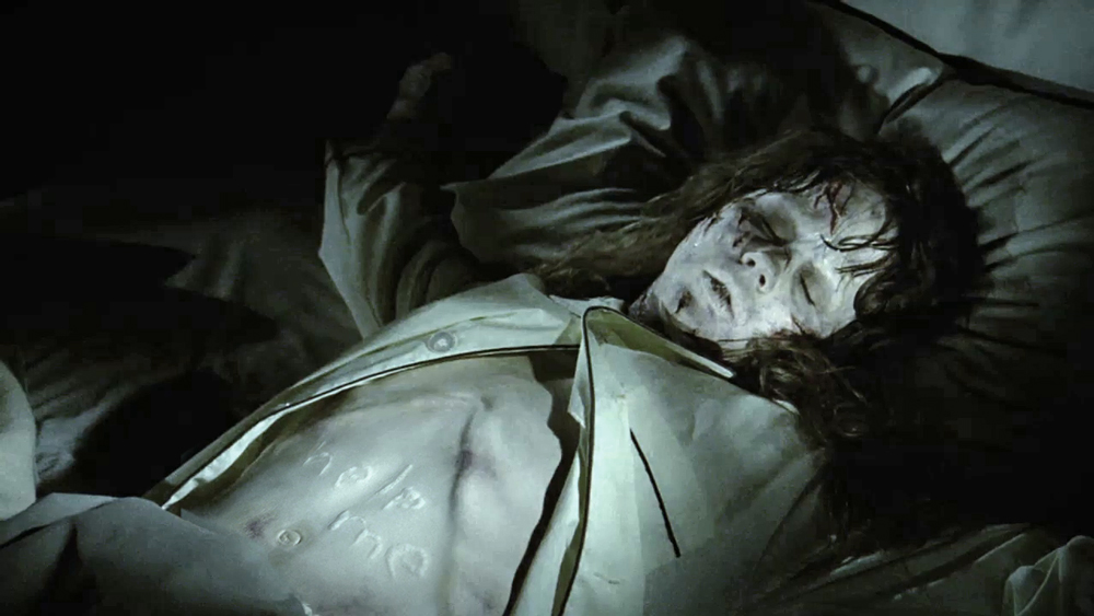 The effect where words appear in Regan's skin was achieved by making a latex replica of Blair's belly and writing “help me” with cleaning fluid. Dick Smith then heated the blisters to deflate them. The film was run backwards and it looked like words rising from her skin.