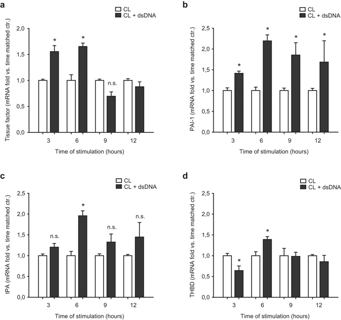 dsDNA induces upregulation of procoagulant proteins: tissue factor and plasminogen activator inhibitor-1 (PAI-1) in endothelial cells.