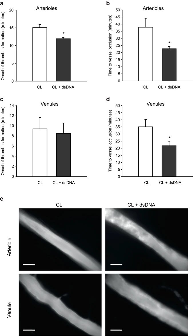 The dsDNA injection with cationic lipids resulted in a more rapid onset of thrombus formation in arterioles