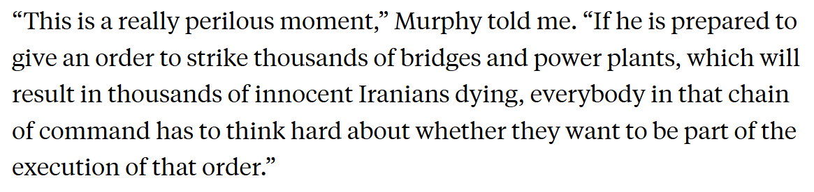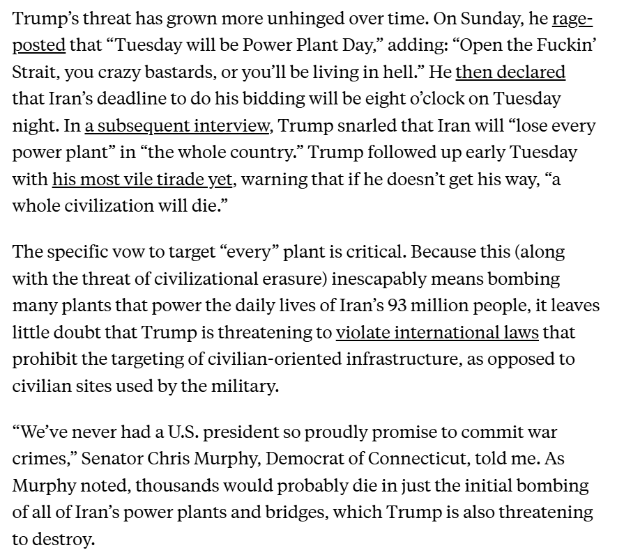 Trump's threat to bomb "every" power plant in Iran is the key. That leaves no doubt he's threatening war crimes. The threat to destroy "a whole civilization" only hammers it home.