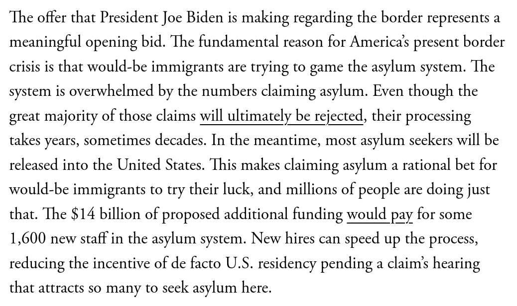 This argument doesn’t acknowledge that Biden/Ds are *already* making a very good offer to Rs on “border security.” Biden’s $ request would spend billions on security *and also* help fix asylum. @davidfrum gets this. 2/
