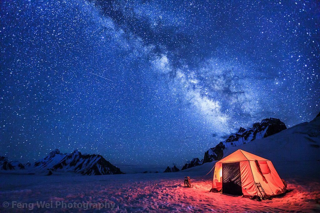 K2 Basecamp: Camp under the shadow of the mighty K2 and witness a celestial display like no other, as the world's second-highest peak guards the secrets of the universe above. 🏔️🌌
