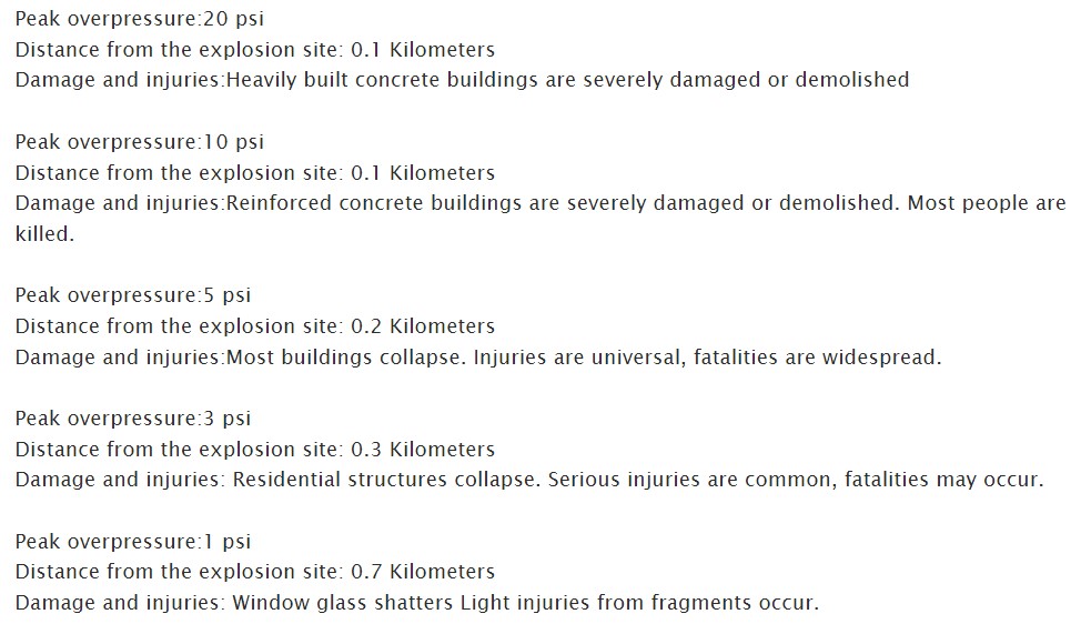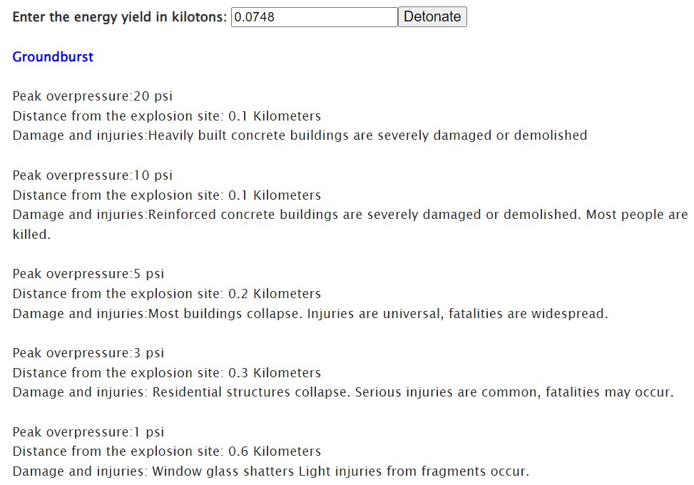 That works out to 0.0988 kilotons. I ran this TNT mass number through the blast calculator app with no change in results.