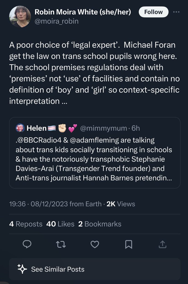 Robin talking absolute bollox again. Sorry for the language but I’ve lost my patience. Robin is pretending that a statutory obligation to provide separate facilities for boys & girls doesn’t require schools to provide facilities for boys & girls to use separate from each other.