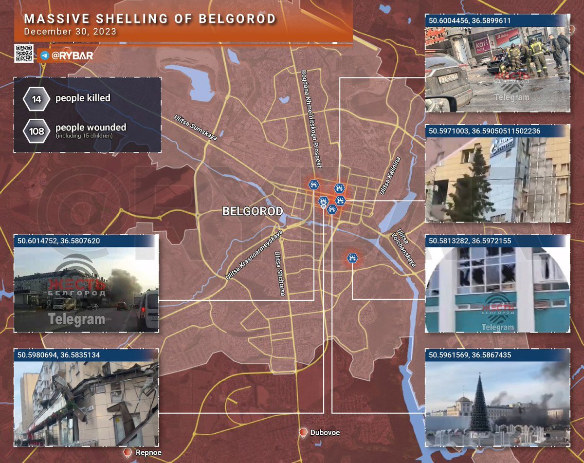 One little footnote. Rybar is sharing this map on Telegram, but maps anything from blown out windows all the way across town to the key strikes we saw downtown.