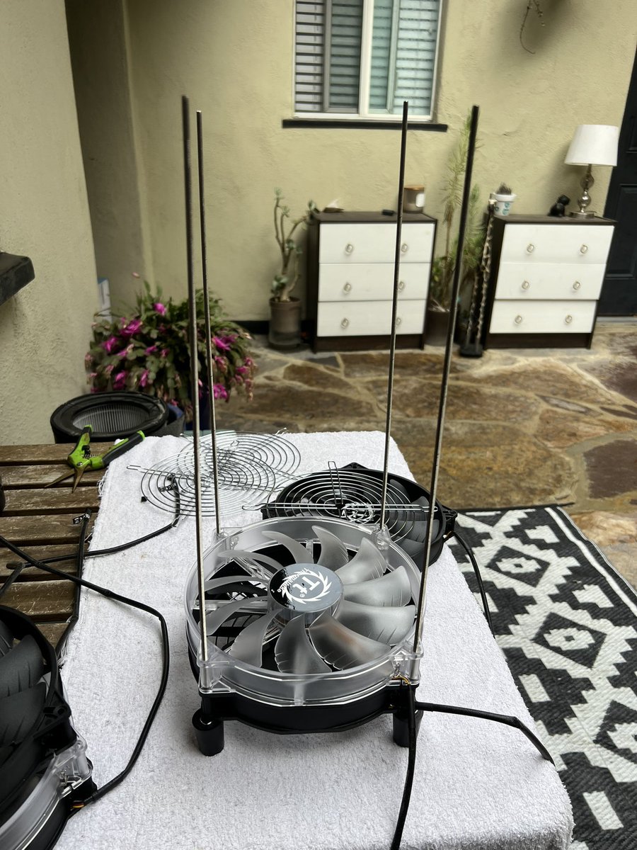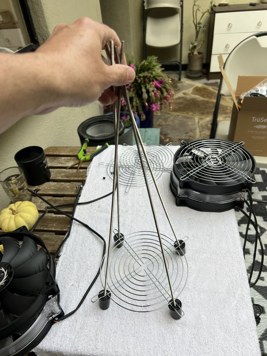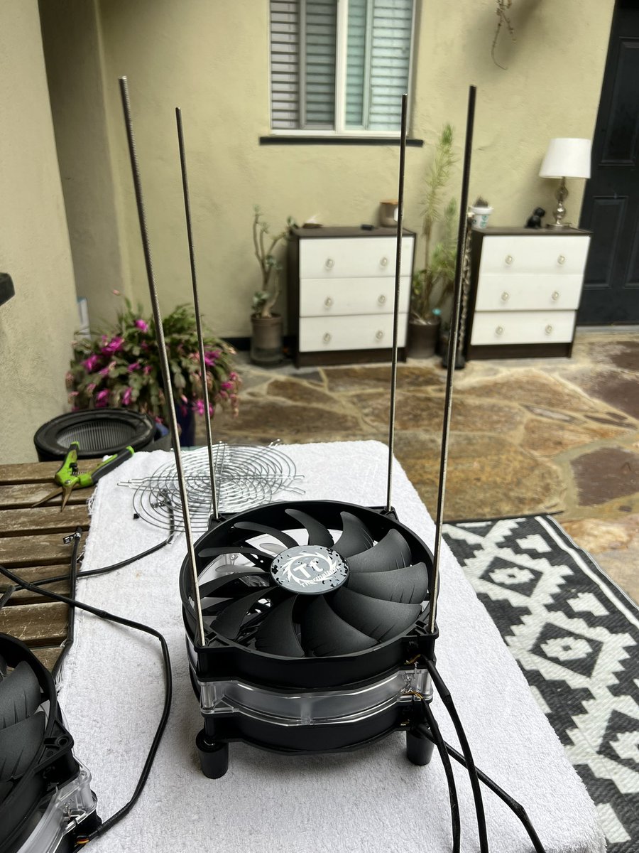 Make the first 3 fan stack. Guard, fan, fan, fan, guard. Shimmy each down carefully and slowly. If you bend the rods they can be straightened but avoid. Always be sure wires and orientation are right; these fans blow downwards. Wires connect to 3 way splitter and 2 way power