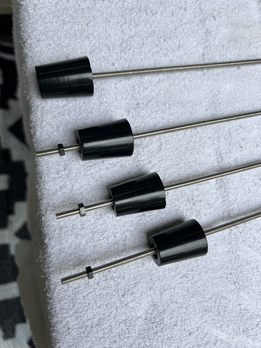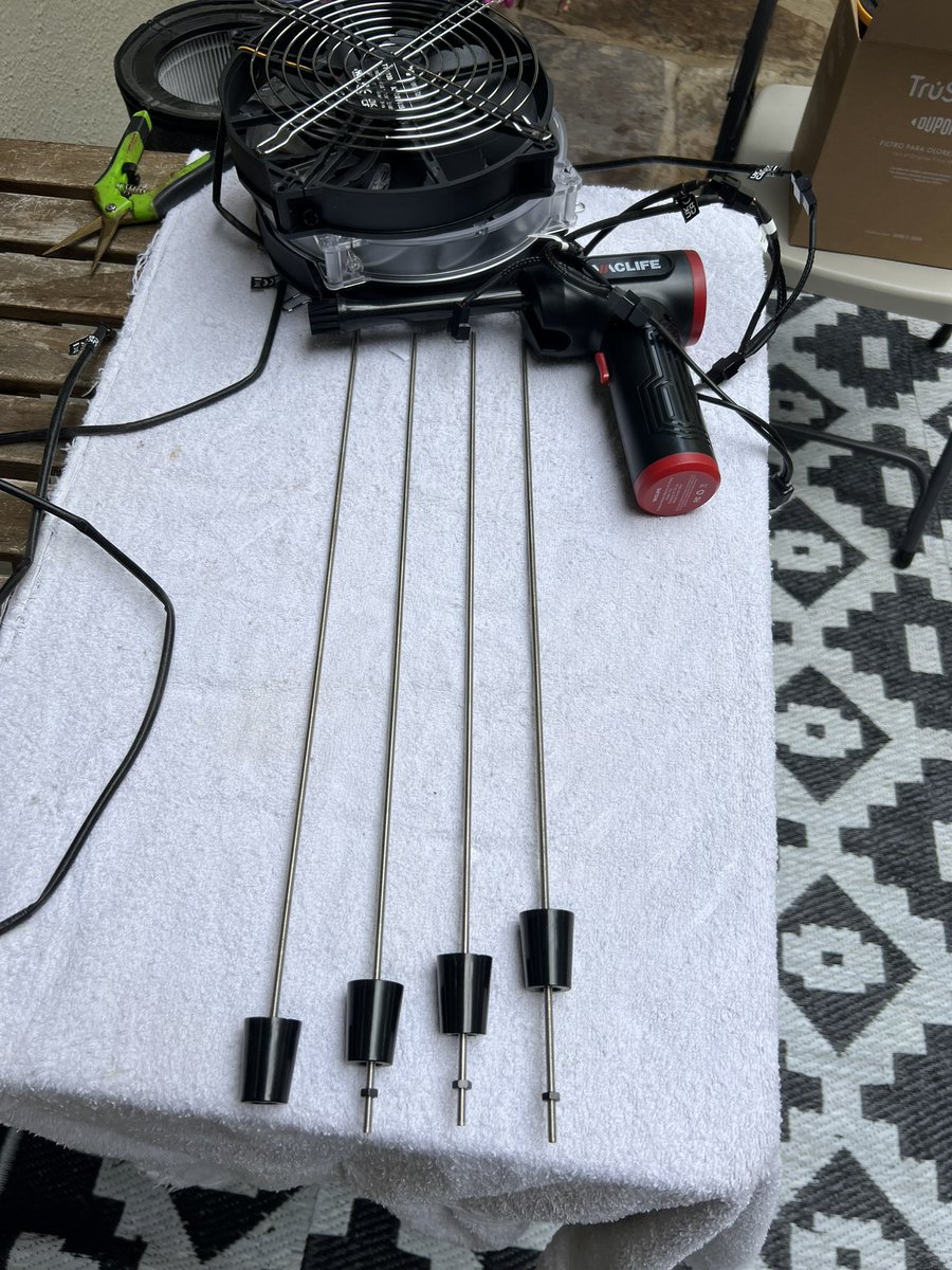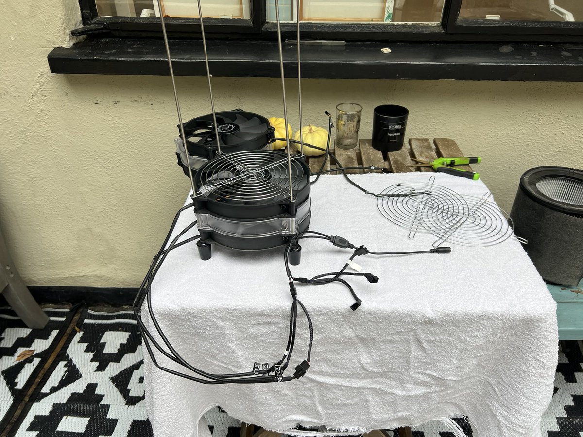 Make the first 3 fan stack. Guard, fan, fan, fan, guard. Shimmy each down carefully and slowly. If you bend the rods they can be straightened but avoid. Always be sure wires and orientation are right; these fans blow downwards. Wires connect to 3 way splitter and 2 way power