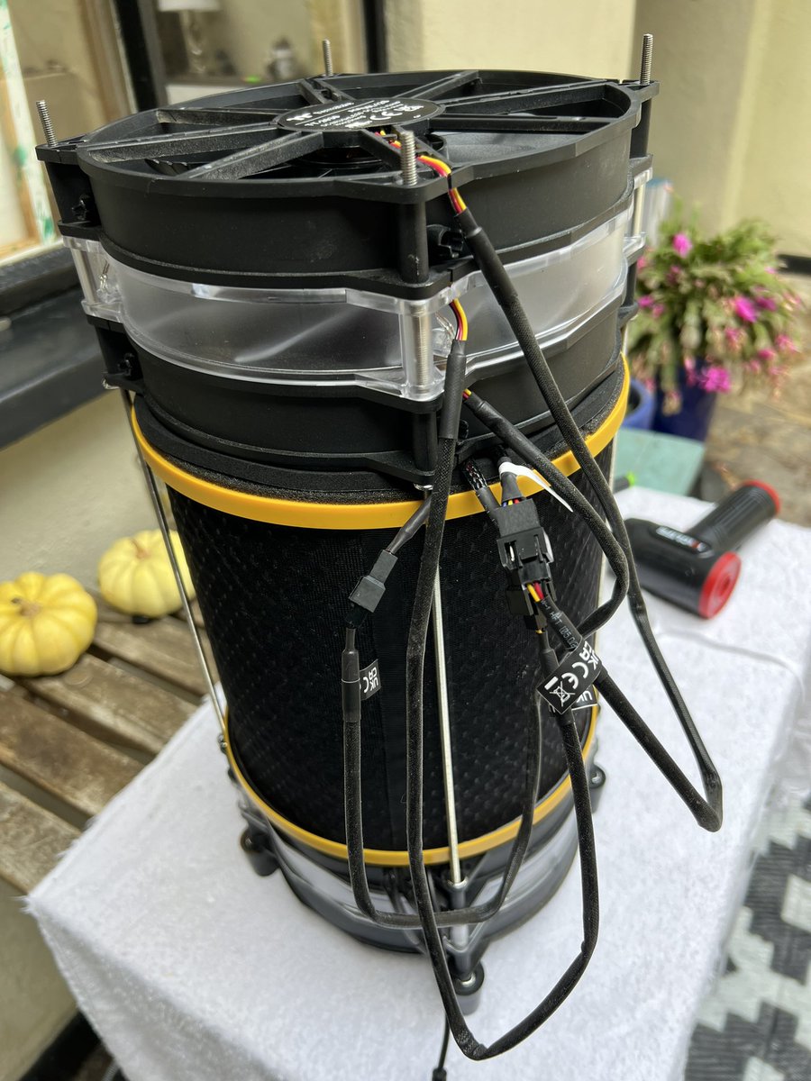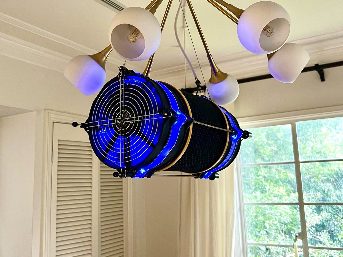 Here it is in all its beauty. You have the parts, it’s time to build. It’s simple: everything is stacked on the supporting rods and the wires are hidden in the middle. Let’s gooo… Fully tricked out Warp Core Fandelier Maxx air purifier