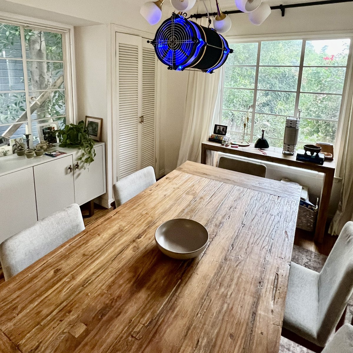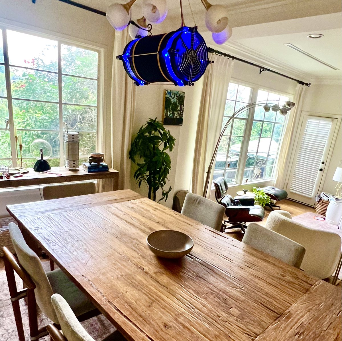 Here it is in #fandelier configuration, hanging by a single wire attached to either end of one rod. Serious air cleaning power for safer dinners with friends. (After testing and with windows/doors open too natch)