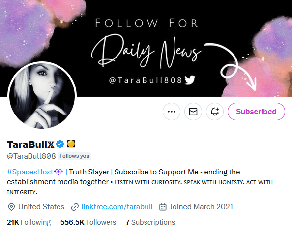 #3 Tara (@TaraBull808) is known for her concept of '10 Things The Mainstream Media Did Not Tell You This Week' posts, which were quickly copied by other major accounts. To see her tweets, I had to subscribe to her. She is worth every cent.