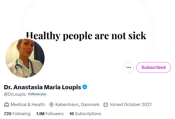 #7 Ana Loupis (@DrLoupis) is a vibrant personality on this platform, often dissecting 'the current thing' (i.e. Covid, Ukraine, Gender Madness) with her directness, which is probably not favored by the algorithm. Almost no one is as frequently shadow and search banned as she is.