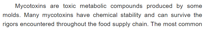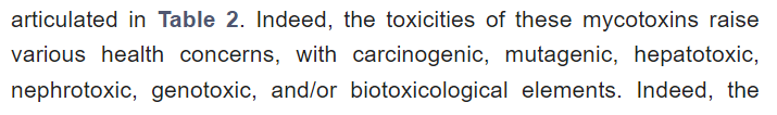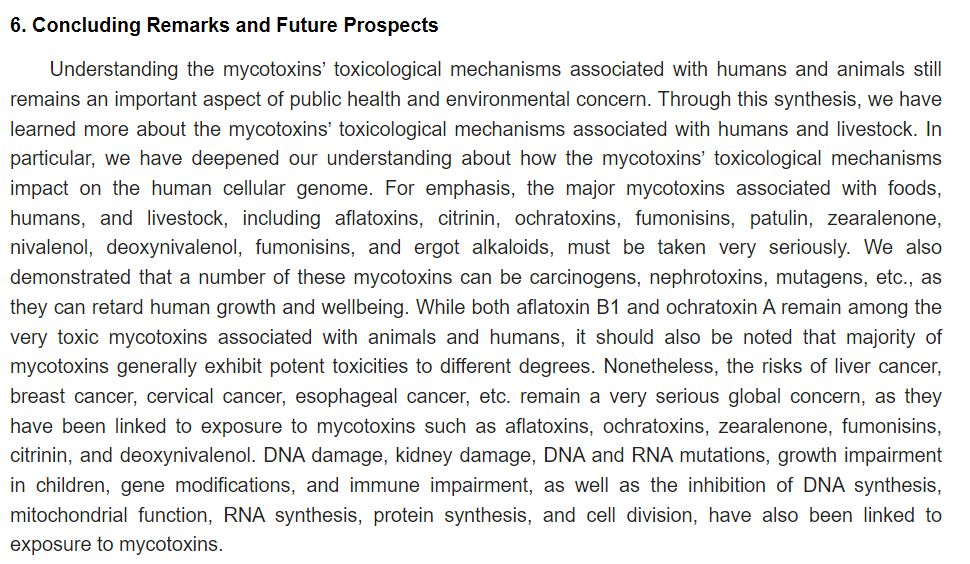 Alussa todetaan, että toksiineja erilaisine haittamekanismeineen on satoja. Toksiinien vaikutuksista ei kuitenkaan kerrota enempää. Esim lähdeviitteessä 64 kerrotaan mykotoksiinien aiheuttavat sekä akuutteja myrkytyksiä että kroonisia terveyshaittoja. 3/ mdpi.com/2072-6651/14/3…