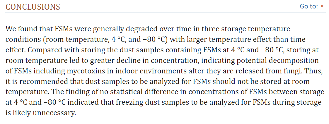 Lähteestä selviää, että toksiinien hajoaminen pölystä otetussa näytteessä käynnistyy huoneenlämmössä. Näytteen säilyttäminen huoneenlämmössä viikkoja tai kuukausia ennen analysointia saattaa siis vääristää mittaustuloksia. 6/ ncbi.nlm.nih.gov/pmc/articles/P…